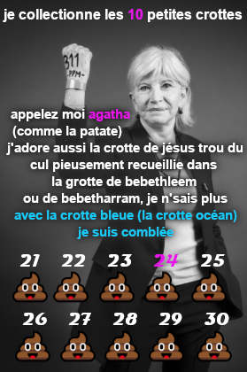 je collectionne les 10 petites crottes : appelez moi agatha (comme la patate), j'adore aussi la crotte de jésus trou du cul pieusement recueillie dans la grotte de bebethleem ou de bebetharram,