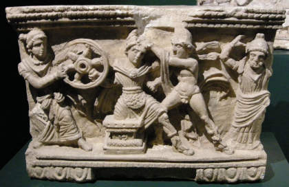 Le martyre de Myrtilos - Urne antique albâtre - Museo etrusco Guarnacci de Volterra en.wikipedia.org - Myrtilus